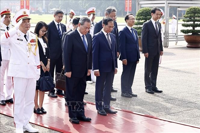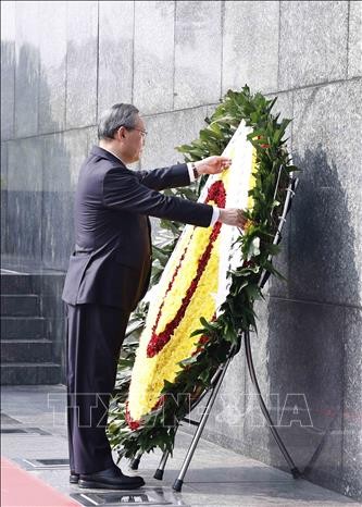 中国国务院总理李强向胡志明主席—越南民族解放英雄、杰出文化家敬献花圈。代表团的花圈上写着:“越南人民永远长存的伟大领袖胡志明主席 - 中华人民共和国国务院总理敬挽”。