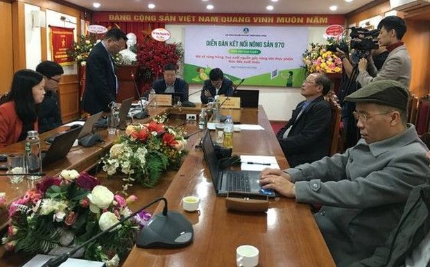 農產品銷售與生產對接資訊論壇調度小組河內會議上公佈產品代碼直播現場。(圖:文福)