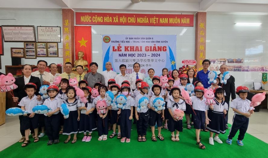 第六郡颍川双语学校今(5)日全体董事会、师生兴高彩烈地举行2023-2024新学年开学典礼。各班小朋友上台表演精彩的越、中文歌舞节目助庆。当日,该校常值副事长赖学良向师生致词祝贺,希望新一学年,该校全体师生带着希望、自信、勤奋和努力,重返校园,开始新的旅程,新一学年取得更多优异的成绩。该校各董事上台赠送安全帽及气球给一年级小朋友迎接新学年(见图)。