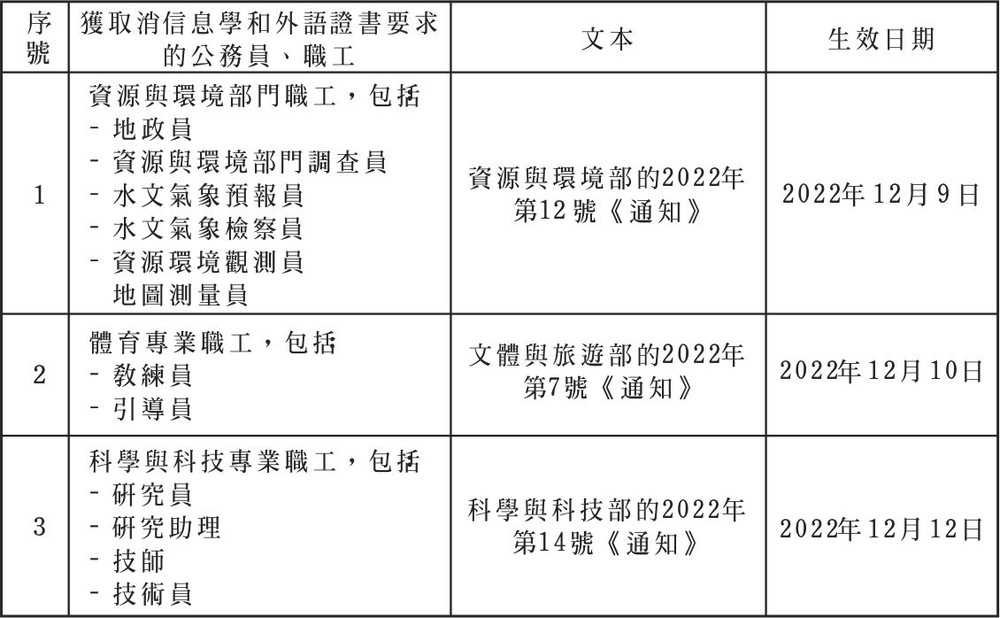 調整對若干行業職工的職稱標準的3項新《通知》自今年12月份起生效,值得一提的是取消對許多職稱的外語和信息學證書要求。具體是: