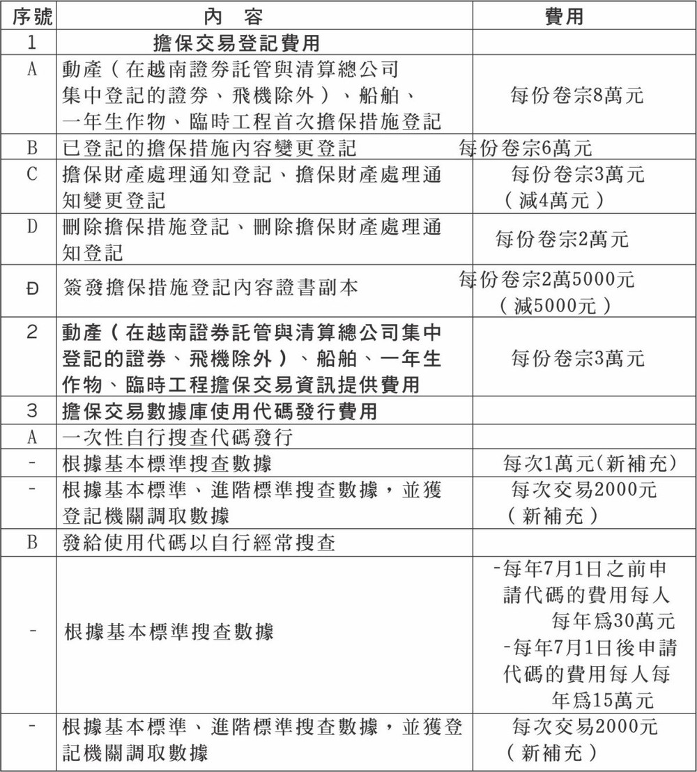 具体是,自2023年11月15日起,担保交易登记费用将按照2023年第61号《通知》附带的新费用表,具体如下: