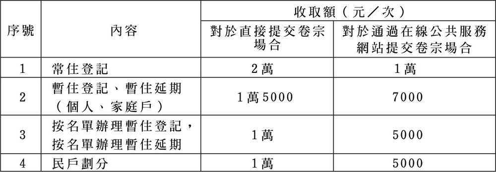 据此,全国不分省、市,按以下表格统一采取居住登记费征收额。