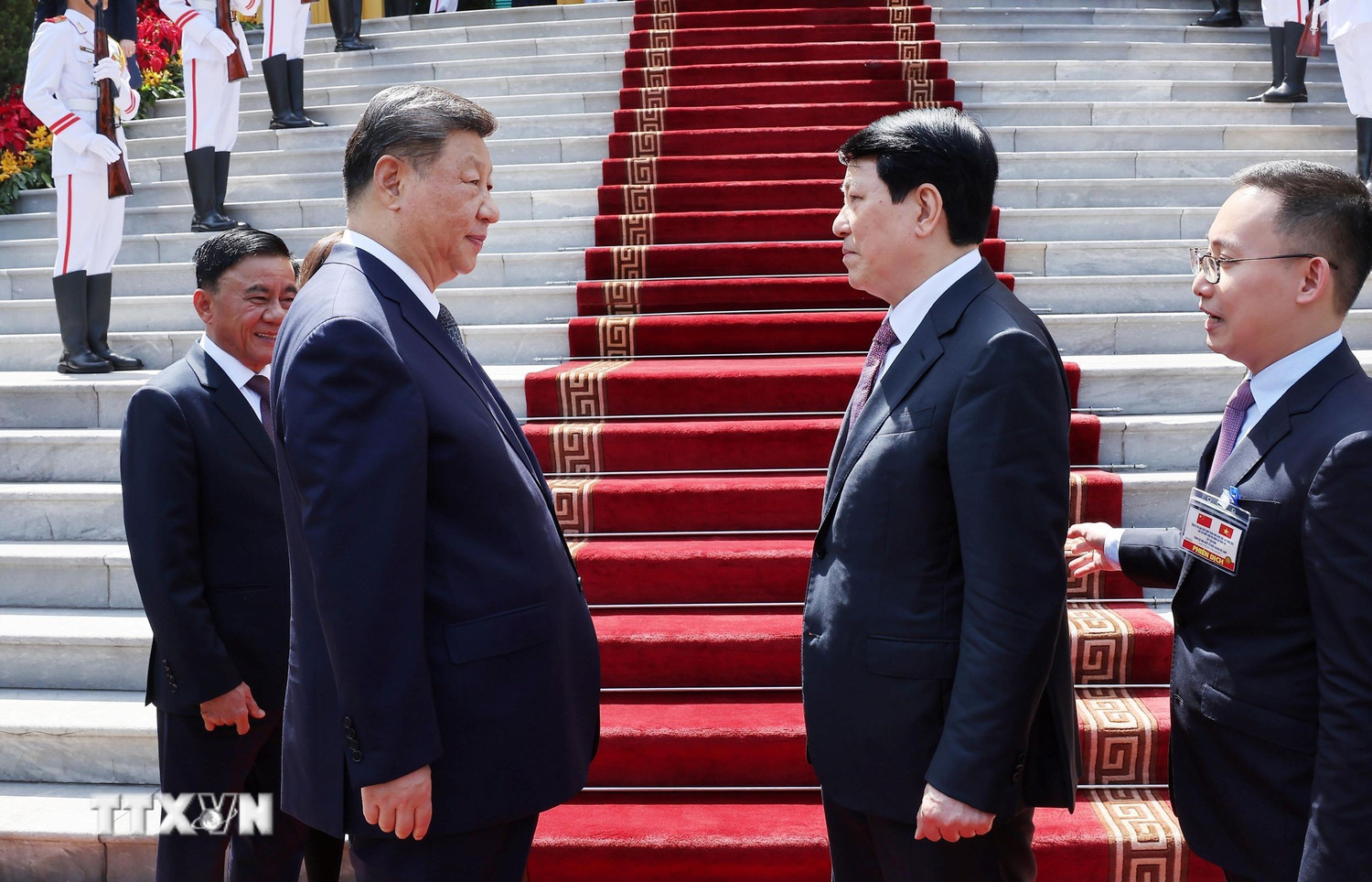 4月15日下午,越南国家主席梁强同中共中央总书记、中国国家主席习近平话别。