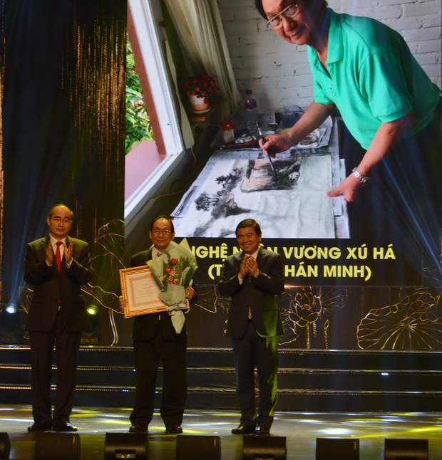 當晚,由阮善仁書記與阮成鋒主席向77位藝人頒贈“人民藝人、優秀藝人"稱號證書。本市華人畫家張漢明、張路在傳承、發揚和傳授水墨畫,龍獅藝術藝人仁義堂團長劉劍昌、衡英堂團長徐梓衡在發揚和傳承龍獅藝術皆有傑出成績,對社會有諸多貢獻,獲得頒贈人民藝人的高貴稱號。