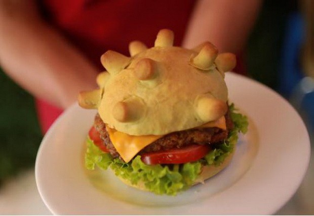在越南河內,“披薩之家”的一位廚師製作了一款類似新型冠狀病毒的漢堡。店主黃松告知,他精心設計了這種漢堡,把麵包用綠茶染成綠色,麵包表面長著一個個小小的“冠狀物”,這看起來就像是新型冠狀病毒在顯微鏡下的樣子。黃松說:“我們經常開玩笑說,如果你害怕什麼東西,就把它吃掉。”所以他把漢堡做成這個樣子來消除人們對這種傳染病的恐懼。“這就是為什麼當你吃了一個病毒形狀的漢堡後,病毒就不再可怕了。這種想法能在疫情中帶給他人快樂。”黃松的外賣店目前每天出售大約50個漢堡。