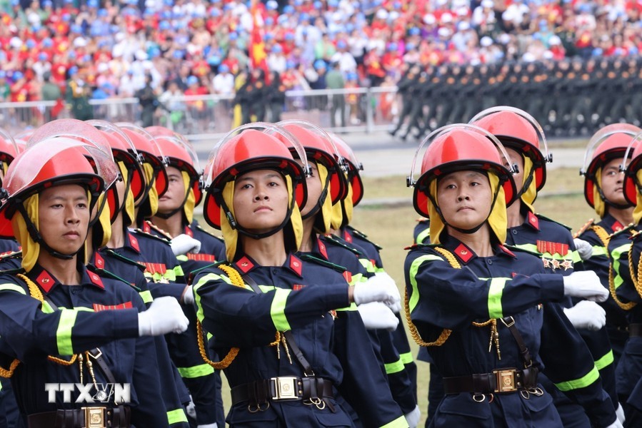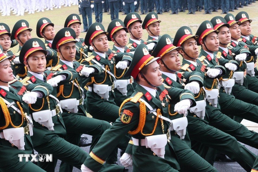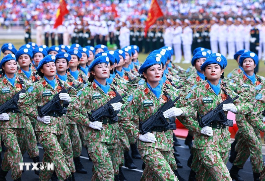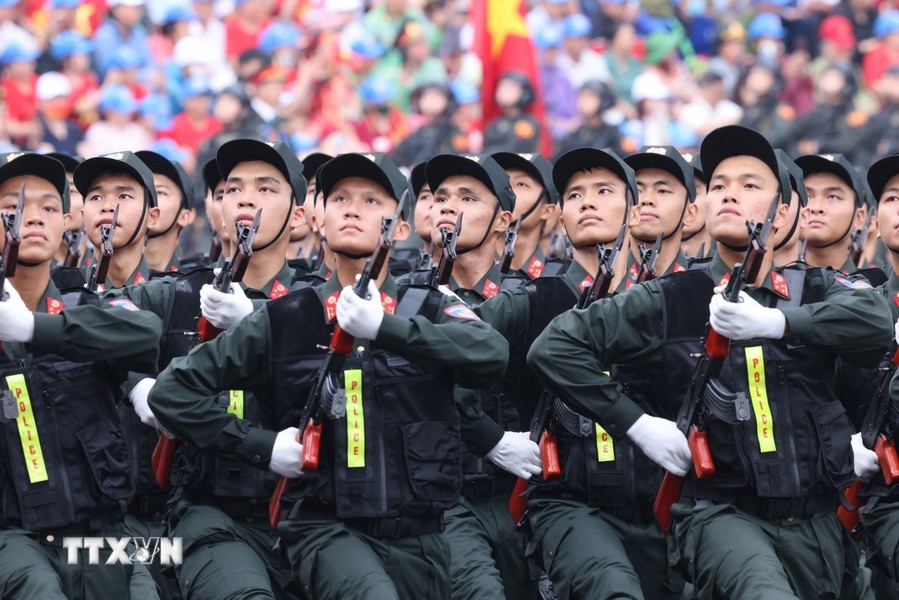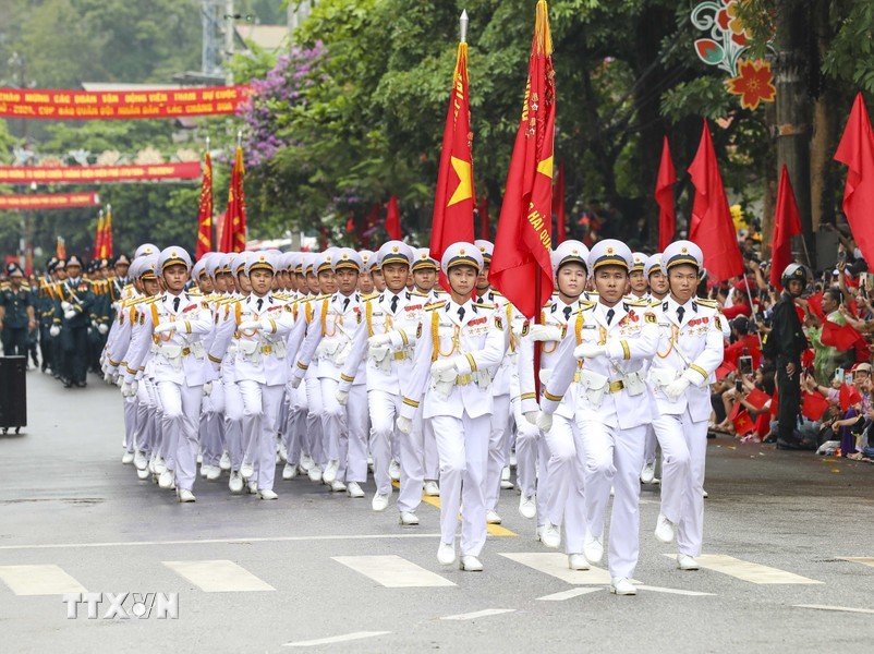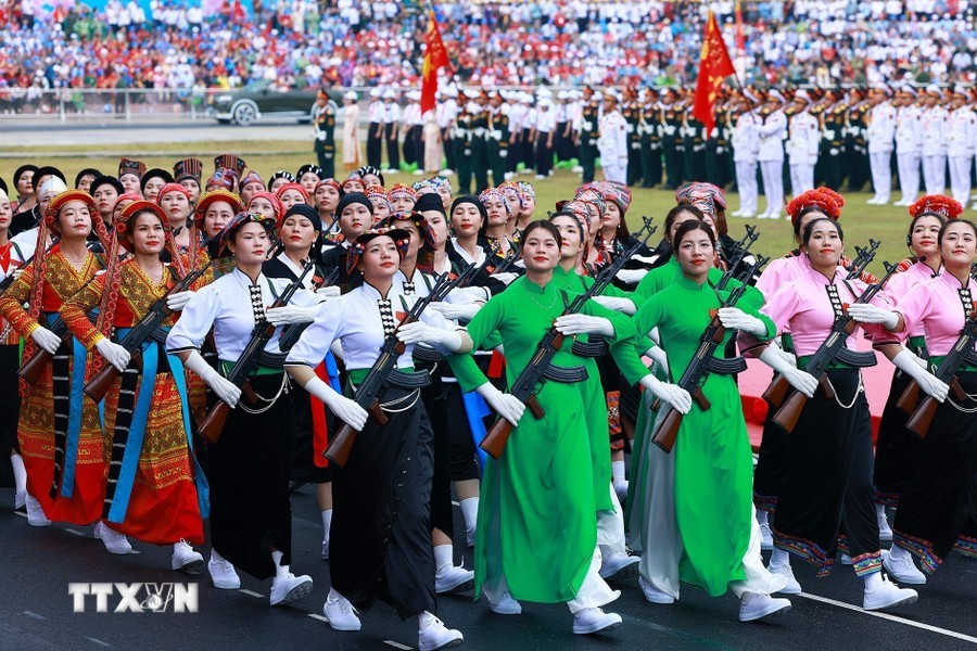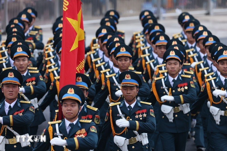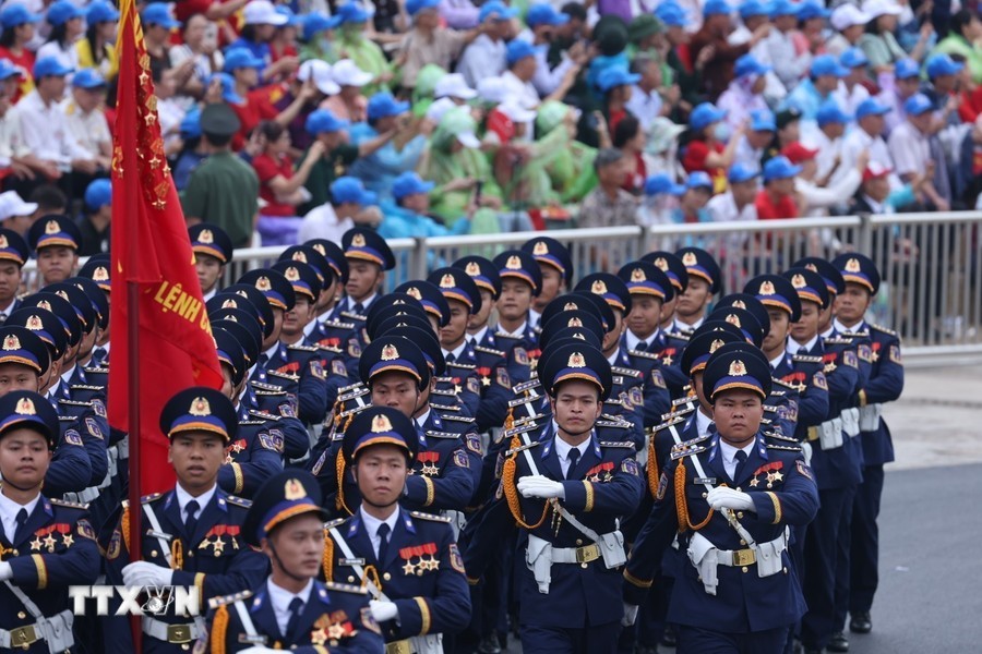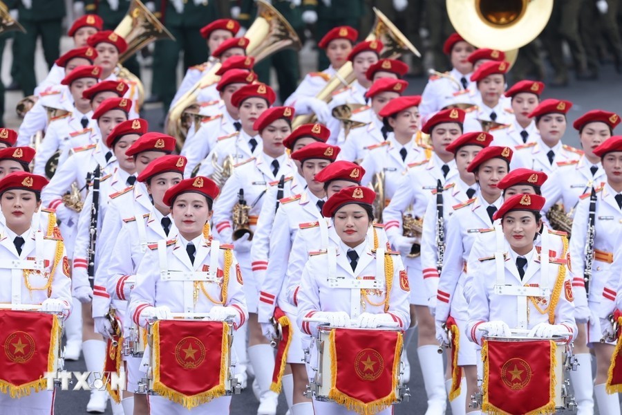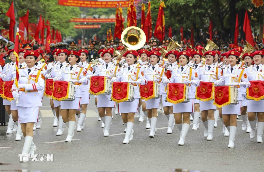 随后是,女军乐队力量演奏豪迈且雄壮的军队音乐。接着是奠边府战士、兵种代表陆军军官集合越南人民军,越南人民海军军官,防空空军军种武装力量,边防部队军官,越南海警军官,军医女军官力量。另一个新力量是网络空间作战力量,越南维和部队,陆军军官,特工战士,越南人民军特任军队,西北民族女民兵,南部女游击队。公安传统旗帜小组指挥车、军旗车,人民安宁军官,人民警察军官,交警女军官,消防与救援警察军官,机动警察军官,特任警察女战士,特任警察战士,骑兵机动警察,红旗队、越南退伍军人,青年突击队,火线民工力量,工人、农民、知识分子、越南青年和妇女、西北少数民族同胞,最后是文化艺术团体。