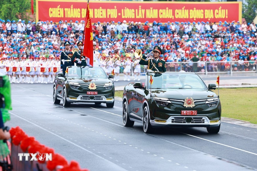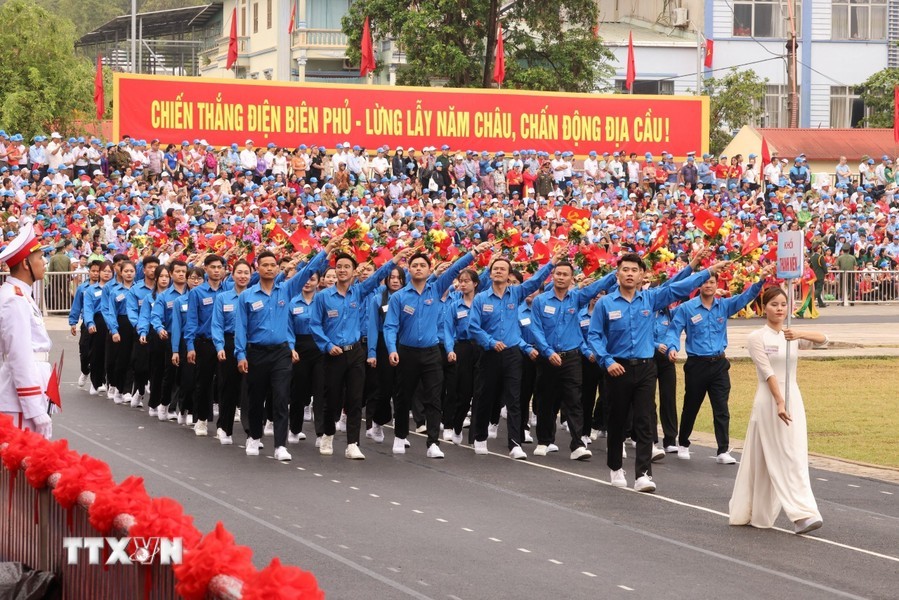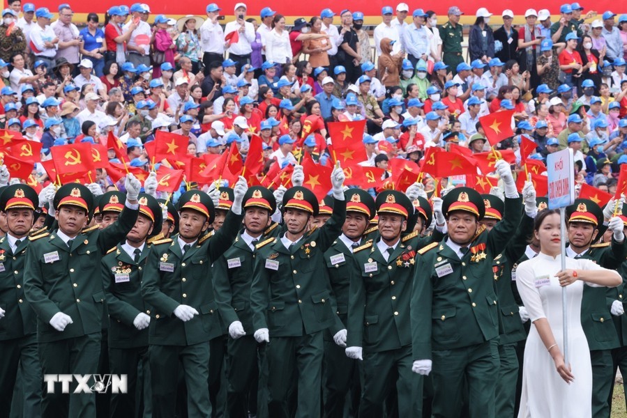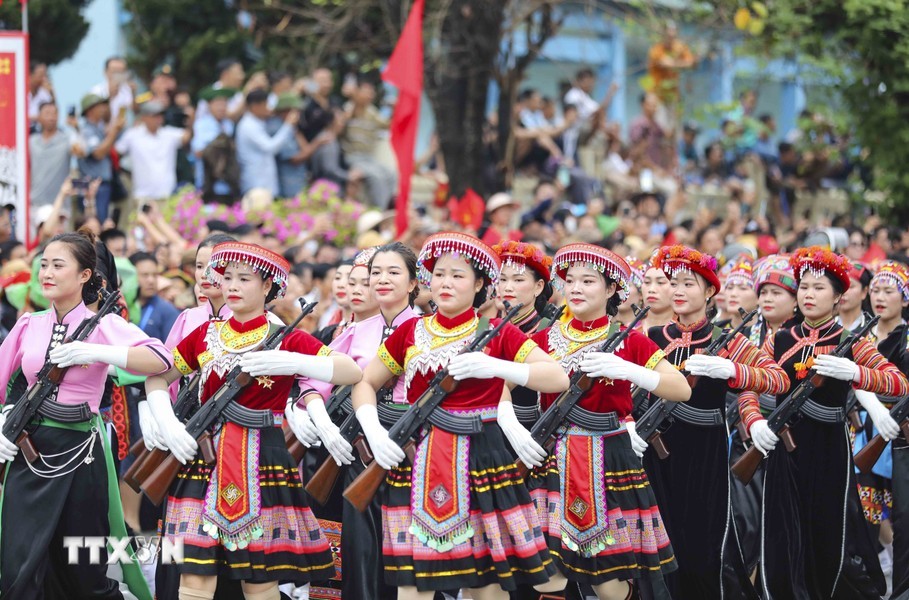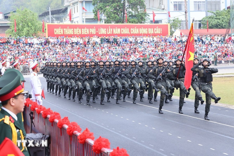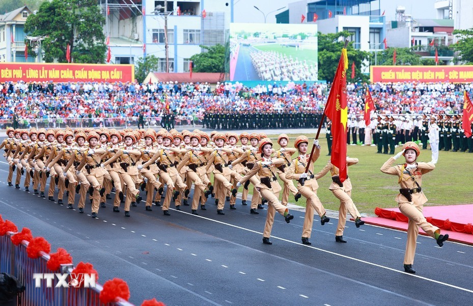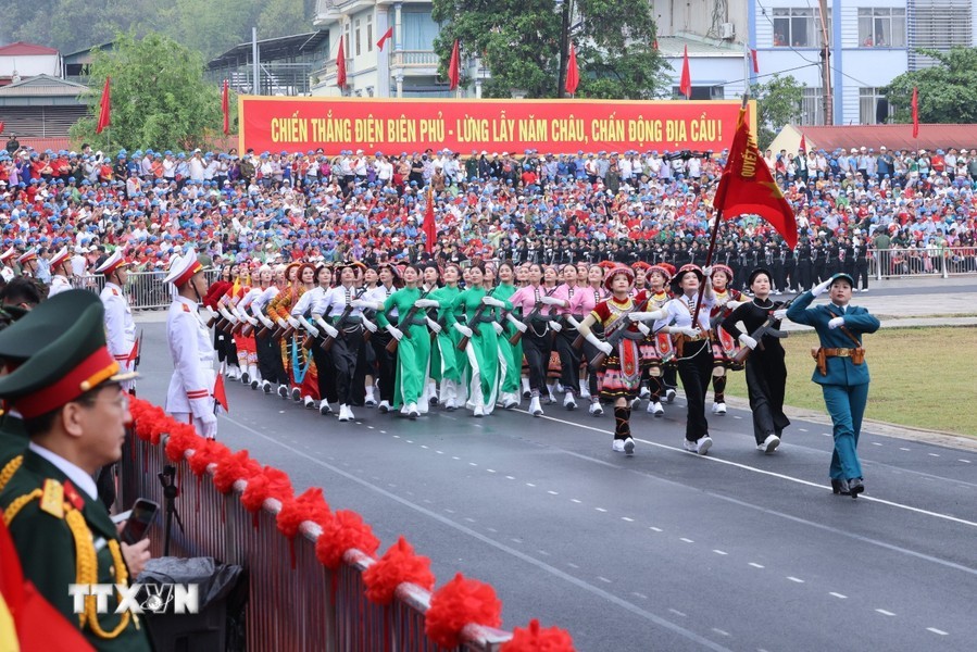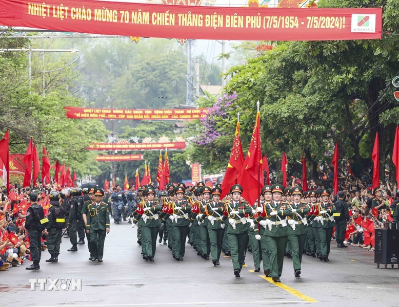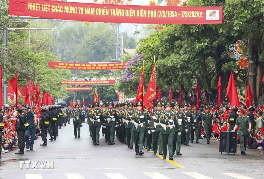 经过观礼台后,上述阅兵游行力量途经奠边府市各条街道,并得到街道两旁数万名同胞与游客的热烈欢迎,营造无比欢欣鼓舞的氛围,对历史传统民族豪迈引以为荣与决心团结建设今日取得更多新成就的国家。