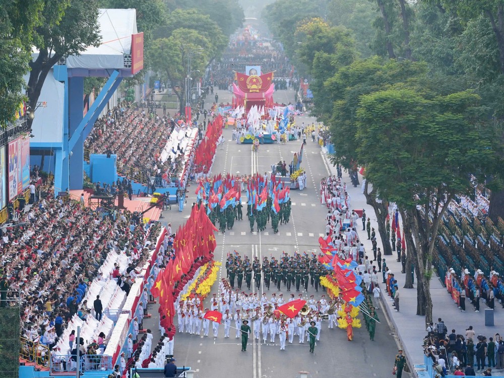 出席阅兵式的有诸位党中央政治局委员:书记处常务书记、2023-2025年三年期庆祝国家重大节日和重大历史事件中央指委会(简称指委会)主任陈锦秀;党中央书记处书记、中央宣教与民运部部长(指委会常务副主任)阮仲义;党中央书记处书记、越南祖国阵线中央委员会主席杜文战;胡志明市市委书记(指委会副主任)阮文年,国防部部长潘文江大将等。