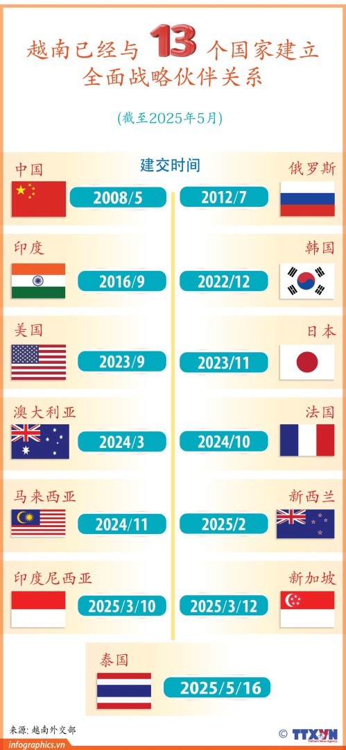 迄今为止,越南已与194个国家建立外交关系,与37个国家建立战略伙伴关系或全面伙伴关系,包括所有大国与联合国安理会五个常任理事国;并是70多个国际和地区组织的积极成员。越南共产党还与119个国家的259个政党建立党际关系。