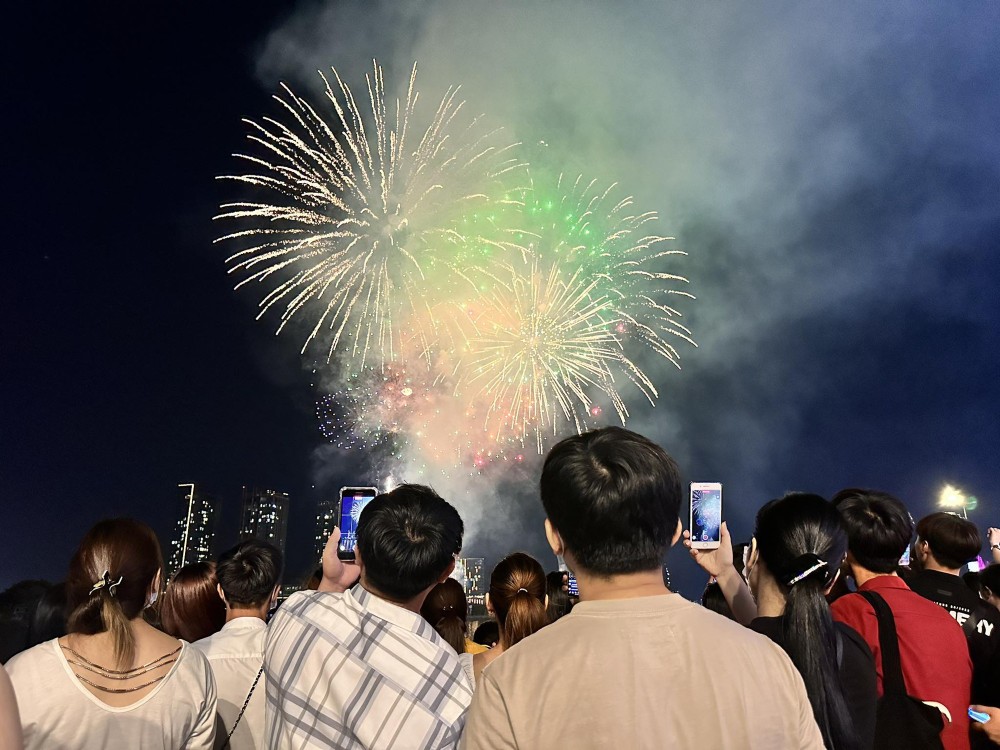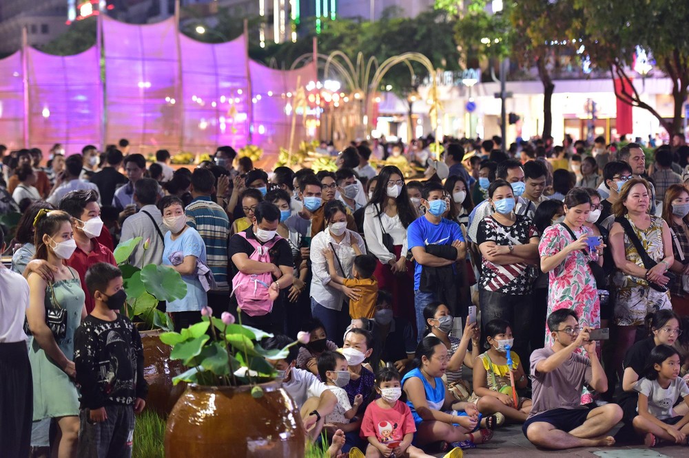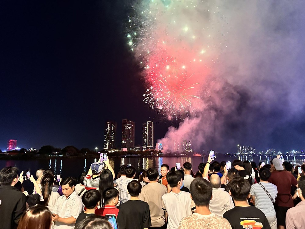 根据观察,众多市民已提早数小时来到西贡河隧道附近、阮惠步行街和白腾码头公园等区域为自己争取最佳的观赏位置。 越接近烟花燃放时间,进入该区的各条街道几乎寸步难移,到处都是人山人海。 家住第六郡的一名市民告知,虽然知道拥挤,但在家看电视永远都比不上在现场亲眼观看的美丽。 准晚上9时,第一枚烟花在上空绽放,大家都兴奋不已。