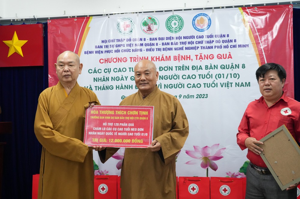 出席当天庆祝仪式的有:第八郡人委会、第八郡民运处、祖国阵线及红十字会领导,同时迎接到第八郡佛教会会长,红十字会辅助会会长释慧功和尚、第八郡佛教会证明释真静和尚、各寺院法师僧尼,以及各赞助单位热心人士的光临,一齐给120位高龄者赠送礼物,同时向高龄者表示祝福,并亲自慰问了高龄老人。释慧功和尚在致词中,特别提出应多关心社会上高龄人仕的生活,照顾好老年人的健康,让他们在晚年中,能有一个安稳欢乐的生活。同时感谢各热心赞助单位的盛情支持,使到大会圆满成功。
