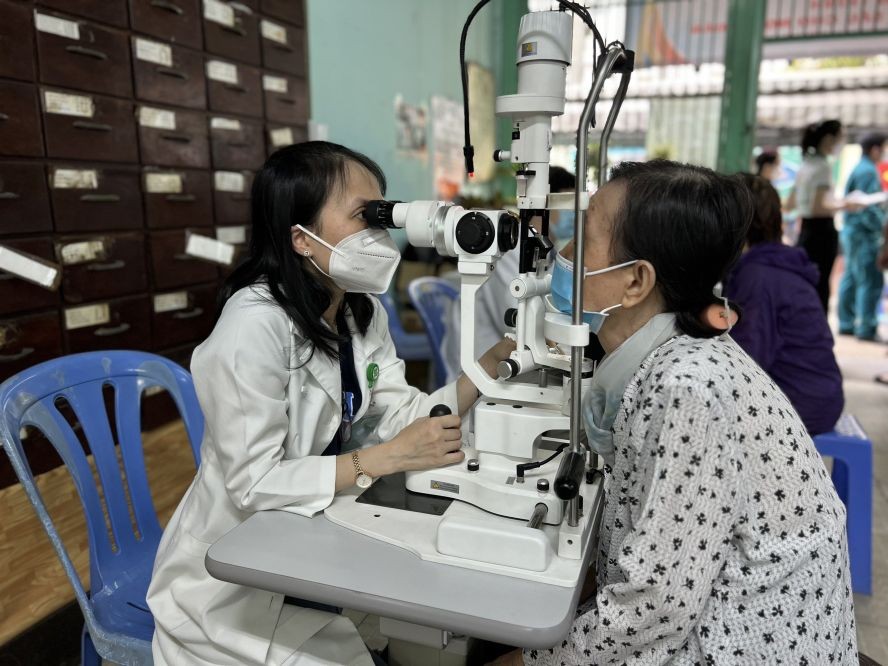 (又讯)值"二二七"医生节来临,于今(15)日,第五郡第十一坊人委会与西贡吴家嗣医院、卫生科、妇女会等部门配合举办为居民免费作眼科诊断(见图)。当天已为300名中年人诊断同时还免费派发药品。第十一坊人委会非常感谢西贡吴家嗣医院的医生已创作条件让当地中年人有得诊断眼科,让他们即早发现病况以及时治疗。