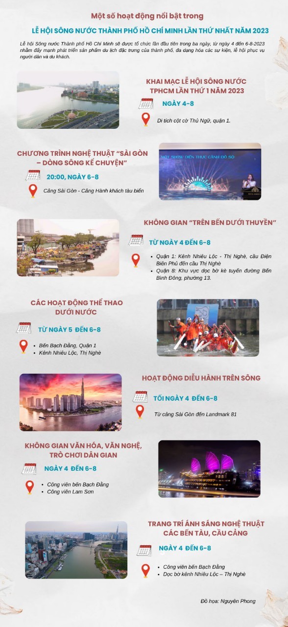 胡志明市旅游厅厅长阮氏映华表示,该活动将于2023年8月4日至6日在多个地方举行,包括西贡港、白腾码头公园、绕禄-氏艺涌、平东码头、仙泉文化旅游区等。活动期间的亮点是题为“西贡河讲故事”的文艺汇演活动。