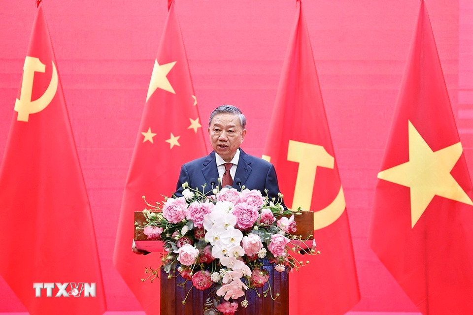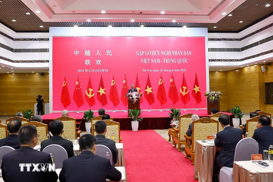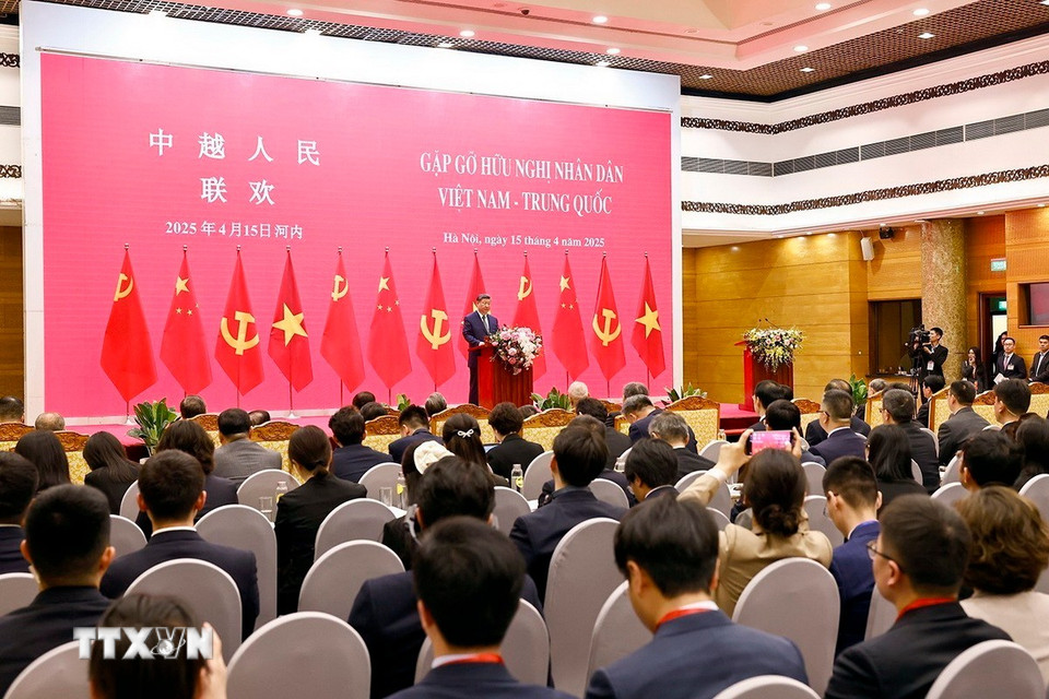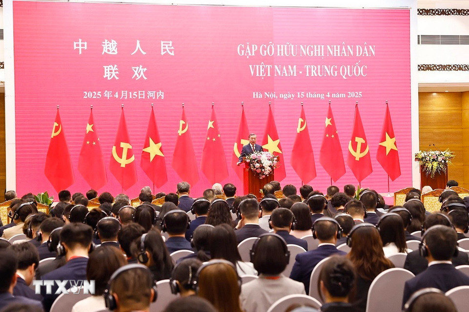 4月15日上午,在河内国际会议中心,党中央总书记苏林、国家主席梁强与中共中央总书记、中国国家主席习近平以及越中两党和国家高级领导人共同出席越中人民联欢暨青少年红色研学之旅启动仪式。