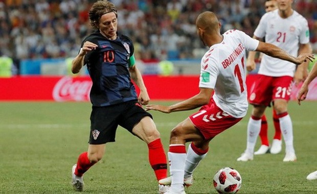 2日淩晨1時進行的1/8決賽第四場比賽丹麥對克羅地亞。這一場同樣120分鐘內1-1戰平,點球大戰克羅地亞4比3淘汰丹麥。丹麥開場57秒進球,從界外球擲入禁區內,德萊尼Delaney混戰中小禁區邊緣轉身拉球,M-約根森(Jorgensen)小禁區附近低射,舒梅切爾( Schmeichel)撲擋後偏轉擊中左側立柱內側入網。克羅地亞第4分鐘扳平,拉基蒂奇( Rakitic)禁區右側傳中,達爾斯高(Dalsgaard)解圍打中隊友後背彈回,曼朱基奇(Mandzukic)小禁區邊緣外轉身淩空掃射入網,1-1。克羅地亞點球3-2取勝。克羅地亞1/4決賽將戰俄羅斯。