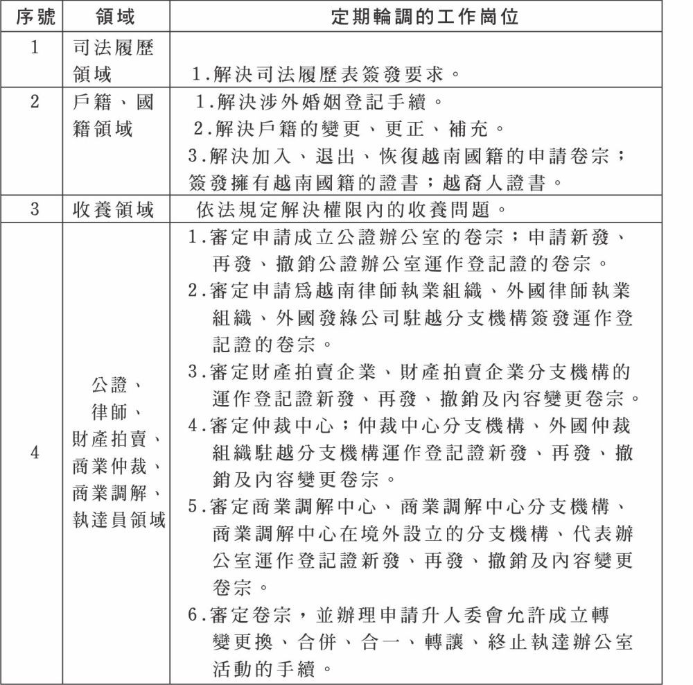 据自2023年10月7日起生效的2023年第5号《通知》,属于司法部管理范围内的在地方政府多个工作岗位须每5年定期轮调,包括: