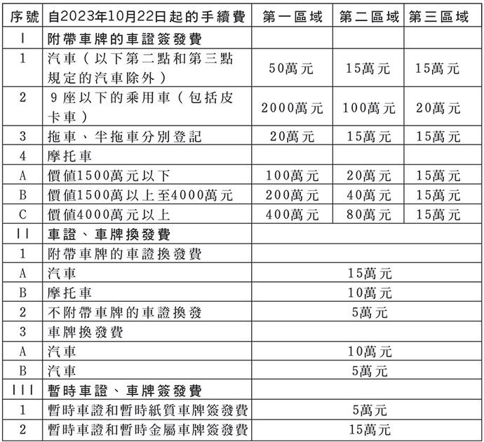 自2023年10月22日起生效的2023年第60号《通知》规定对机动车的新注册费、牌照签发费等。具体如下: