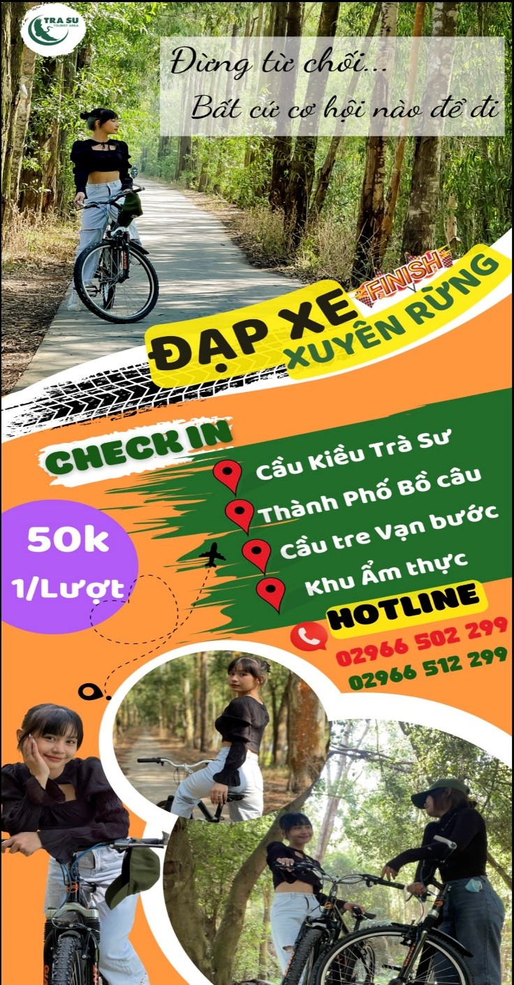 喜欢森林骑车,但很多车手并非随时都有时间远行前往大勒、西原来满足自己的兴趣。告诉各位车手一个好消息,在安江省落成不久的新景点可以满足各位征服绿色步道的心愿,那是茶师白千层生态旅游区,设有出租不同种类、颜色的自行车供游人选择的服务。帮助游客完成边骑自行车边欣赏越南最著名最美白千层林风景的梦想。